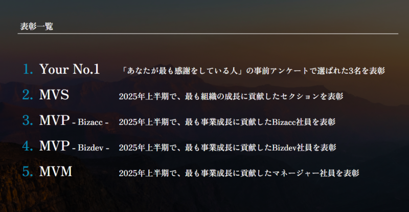 このパートでは、「あなたが最も感謝している人」に贈られる”Your No.1”、半期で最も事業成長に貢献したセクション・プレイヤー・マネージャーを称える”MVS” “MVP” “MVM”の全4部門の表彰が行われました。