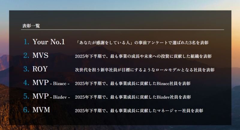 総会の後半では、2025年下期の挑戦と成果を称え合う表彰パートが開催されました。